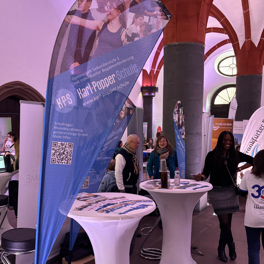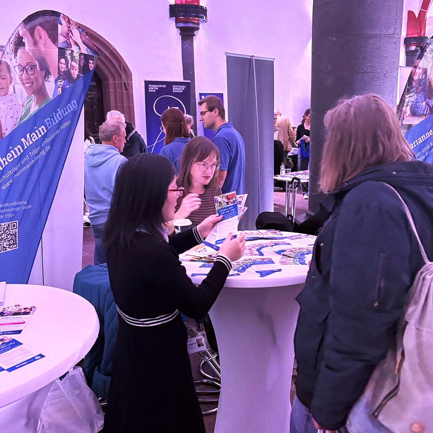 Auch unser Info-Stand stieß auf großes Interesse: Über 100 Neufrankfurter*innen und Neugierige wollten mehr über uns erfahren. Für die RheinMainBildung vor Ort: Geschäftsführer Andreas Schmid sowie Schulleiter Günter Boos und Sandra Neumann von der MFS. Christina Schlimm und Lehrkraft Frau Lei vertraten die Karl-Popper-Schule in Frankfurt Niederrad, die gerade am Vortag ihre staatliche Anerkennung als Gymnasium der Sekundarstufe 1 erhalten hatte. Aber auch das MFS-Konzept mit seinen Montessori-Elementen fand viel Aufmerksamkeit. Insgesamt: Ein inspirierendes Event mit vielen spannenden Kontakten – wir sind 2026 wieder dabei!